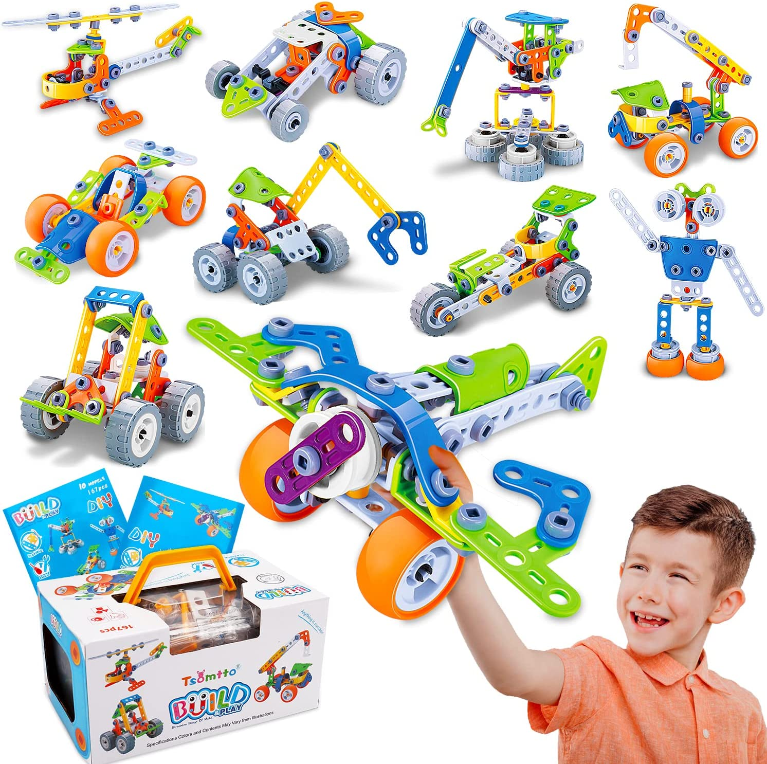 The Ultimate 10-in-1 STEM Building Toys for Boys Ages 4-8 is a fun and educational toy that offers a variety of creative games and activities. With a total of 167 pieces, this toy building set can be built into 10 different models, including a tower crane, crane, forklift, catch car, rocket car, plane, racing car, UTV car, robot, and helicopter. Each set comes with a step-by-step guide booklet that makes it easy for kids to build a variety of patterns. It is the perfect gift for boys aged 5, 6, 7, and older.