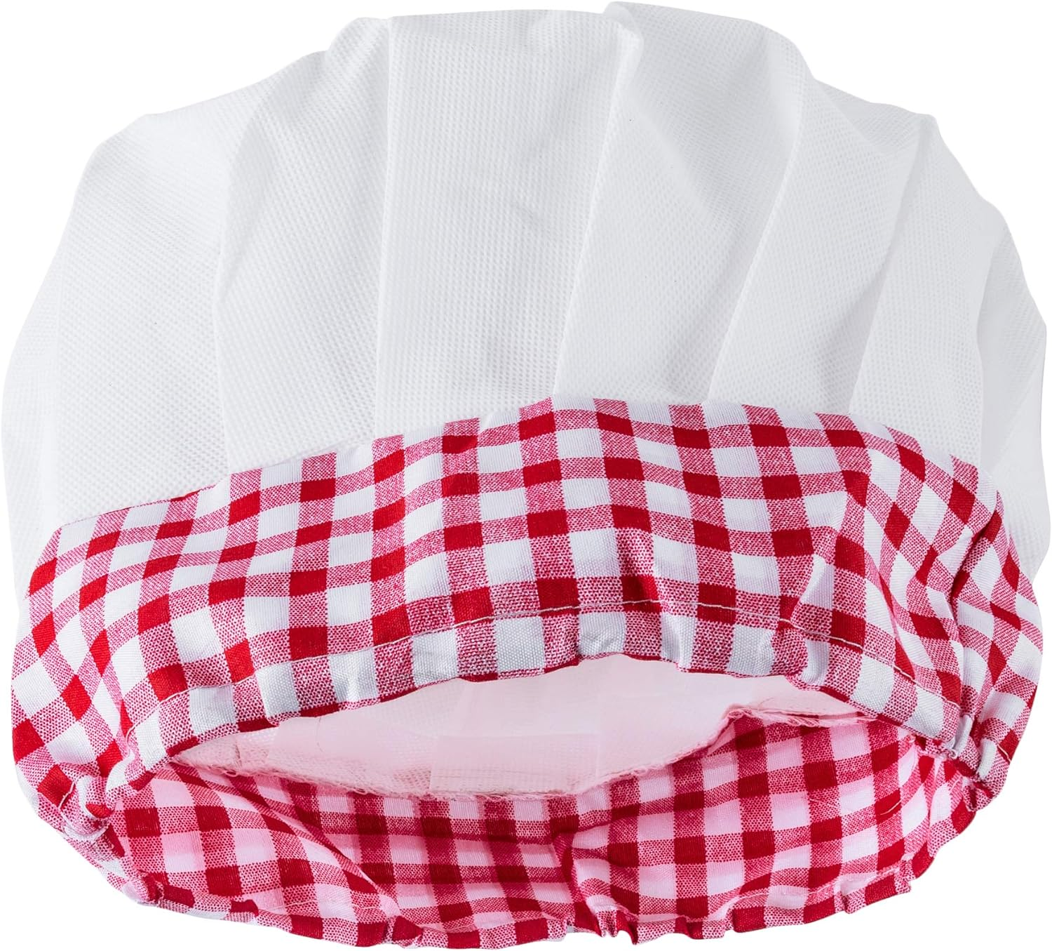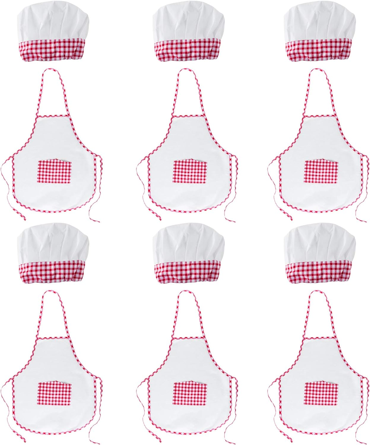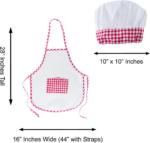 This full unisex cooking dress-up set is recommended for children. One size fits most. The apron strap measures 14″ and is easily adjustable. The package comes with a total of 12 pieces, including 6 aprons and 6 chef hats. The apron is white and red with a plaid patterned pocket, paired with a white chef’s hat with red checkered trim.