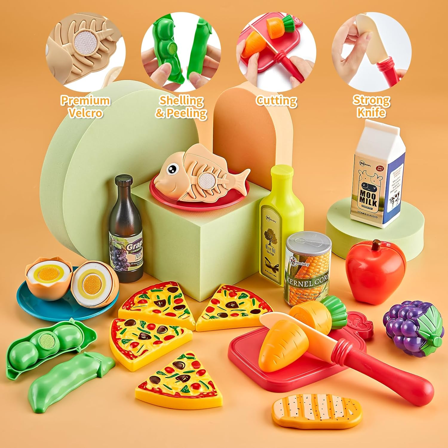 Our play kitchen has a realistic design, allowing kids to slice fruits and veggies, peel peas and eggs, and shell crabs. The special Velcro feature allows them to put the fake food back together so they can slice it all over again. This playset not only provides endless fun but also helps develop fine motor skills, imagination, and creativity.