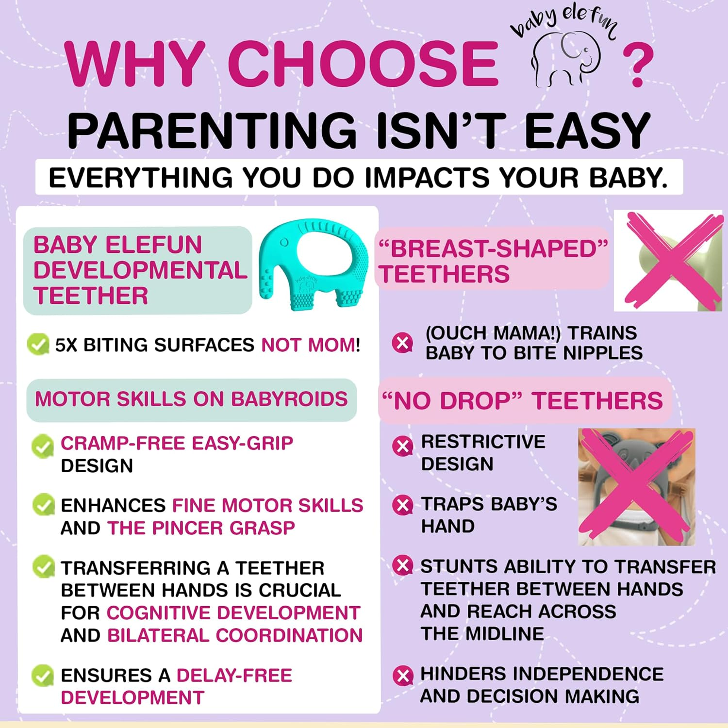 • The Ultimate Baby Elefun Teething Toy is expertly designed to provide effective pain relief for infants aged 0-12 months. Crafted from 100% food-grade silicone, this teething toy is not only safe for your little one but also incredibly easy for them to hold and manipulate. Unlike traditional teething mittens that can hinder the development of essential motor skills, the Baby Elefun teether allows infants to practice grasping and passing objects, fostering their sensory development while alleviating discomfort during teething.