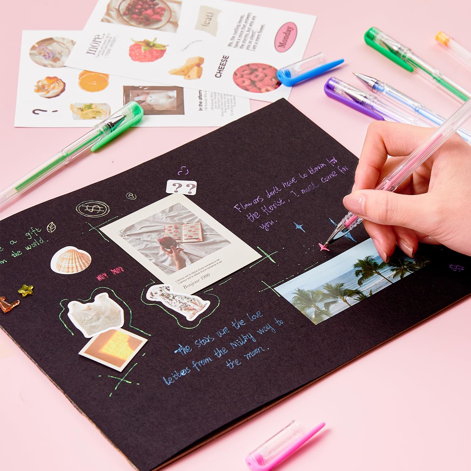 These gel pens excel on black paper, showcasing their milky colors beautifully.