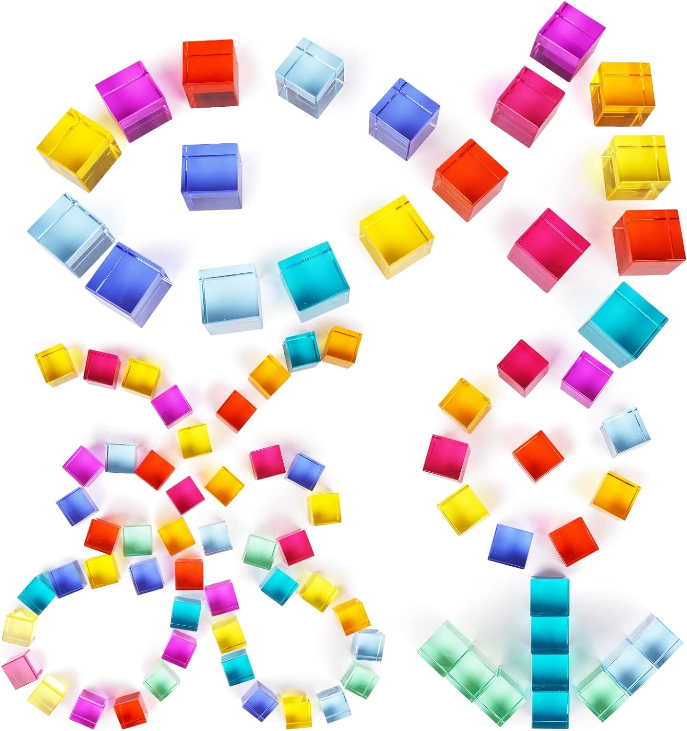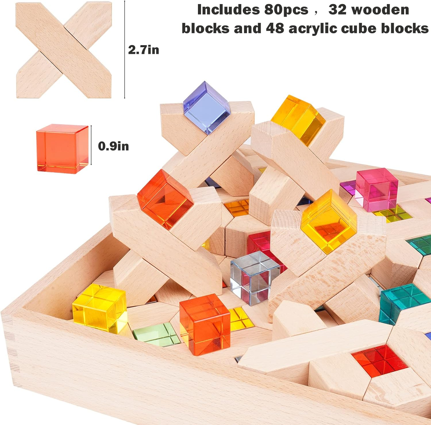 - ✓ ACRYLIC RAINBOW BLOCKS SET – We have included 32 elegant wooden blocks that measure 4 inches each, making them convenient to grab for small hands, and 48 pieces of rainbow acrylic cube blocks in 8 different colors including red, yellow, blue, green, indigo, orange, purple and silver. Each rainbow cube block is 1 inch in size!
