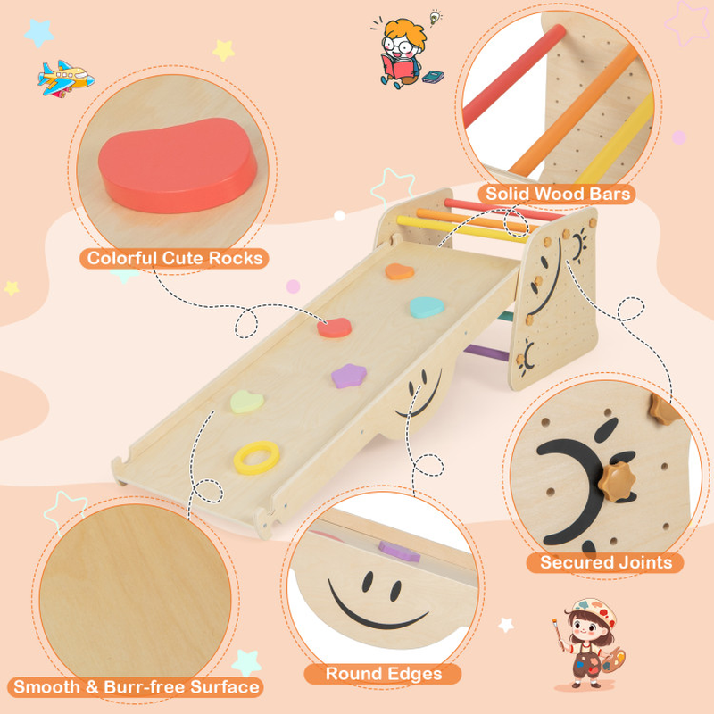 Multifunctional Climbing Set: The Wooden Triangle Climber Set with Seesaw is an innovative and versatile play structure designed to engage children in a variety of activities. This multifunctional toy can be utilized as a seesaw, stool with back support, climbing ramp, sliding ramp, climbing ladder, and step stool, providing endless opportunities for fun and imaginative play. Whether your child is climbing to new heights or enjoying a gentle sway on the seesaw, this climber promotes active play and keeps children entertained for hours.
